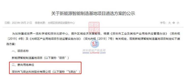 9月21日, 光明区投资促进服务中心公示新能源智能制造基地项目遴选方案,该项目的意向用地单位为深圳市飞荣达科技股份有限公司。