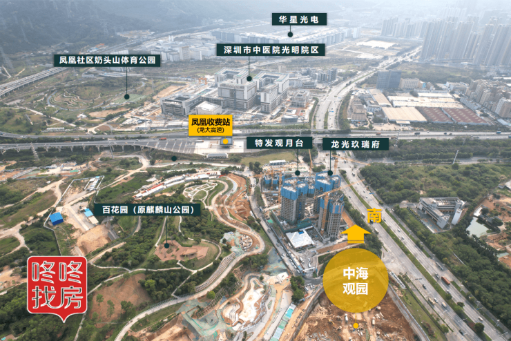 中海观园整体上位于光明凤凰城片区龙大高速和光侨路处,项目旁边有特发观月台、龙光玖瑞府。