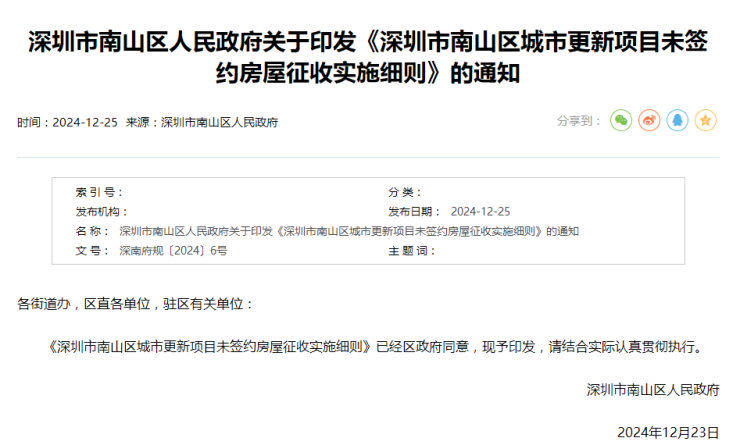 12月25日,南山区人民政府印发《深圳市南山区城市更新项目未签约房屋征收实施细则》(以下简称实施细则),本实施细则自2025年1月10日起实施,有效期5年。