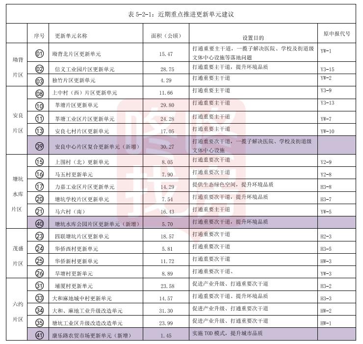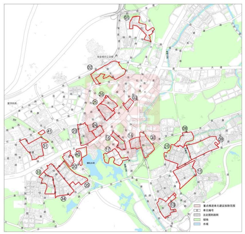 按照交通优先、产业优先、生态优先原则,本次研究建议重点推进以下23个更新(整备)单元,拆除面积3.6平方公里。