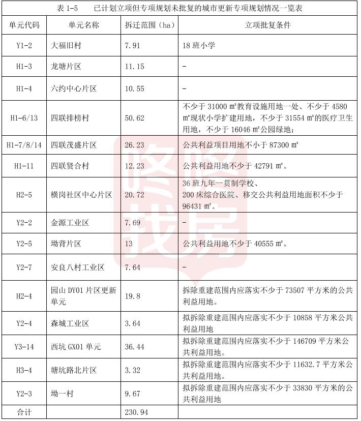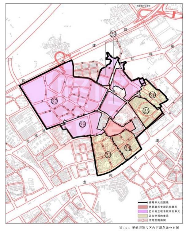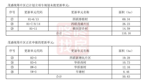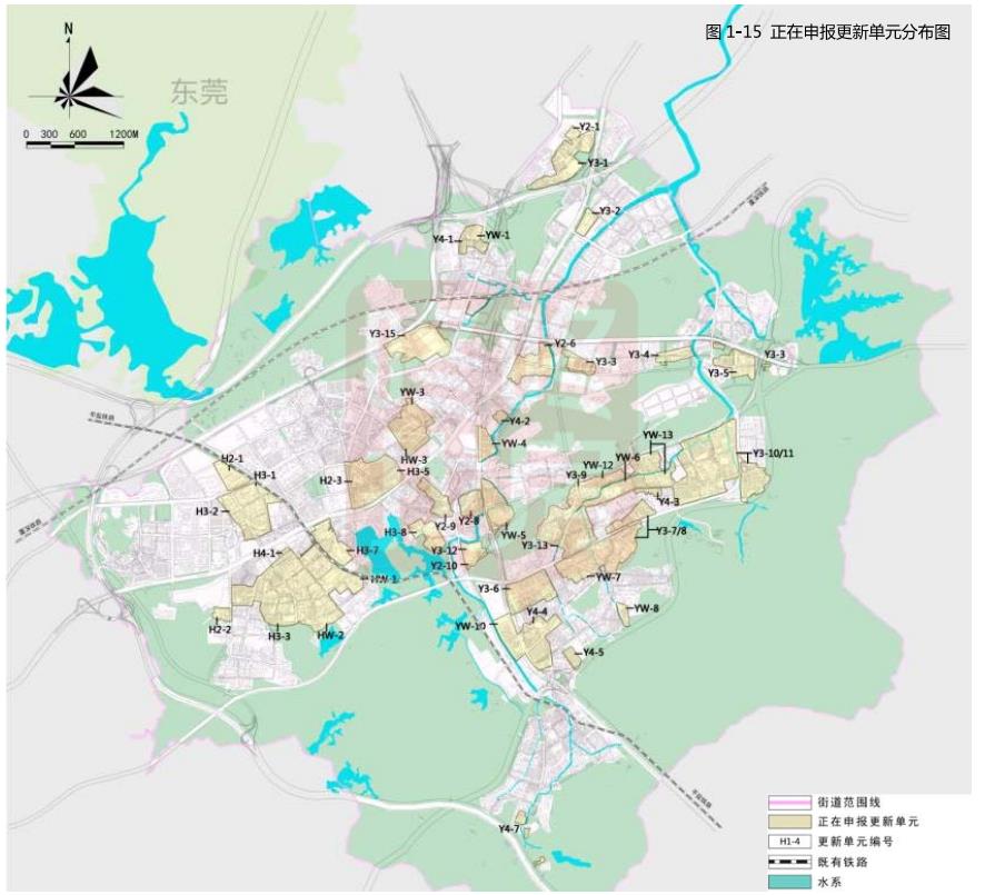 片区内已立项更新单元4个,分别是四联排榜村、四联茂盛片区、横岗贤合村、同兴五金厂城市更新单元,拆除范围110.16公顷;正在申报更新单元有4个,分别是四联新塘坑片区、华侨西村、华侨新村、旱塘村等城市更新单元,面积50. 63公顷。