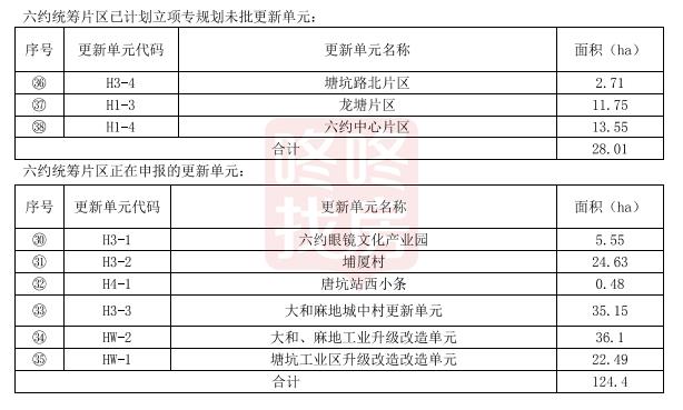 该片区申报更新单元集中连片面积约1.6平方公里,包括龙塘片区、塘坑路北片区、六约中心片区3个已计划立项、但更新单元专项规划尚未批复城市更新单元,面积28公顷;5个正在申报的更新单元,分别是六约眼镜文化产业园、埔厦村、六约麻地-大和-牛始埔南片区、六约大和-麻地片区、塘坑工业区,面积124.4公顷。