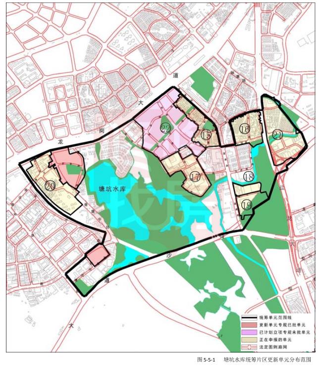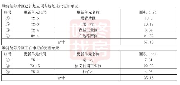 塘坑统筹片区范围内已立项更新单元3个,分别是横岗社区中心片区、塘坑片区、横岗横岗齐藤玩具厂城市更新单元,已立项更新单元总范围面积约33.3公顷:正在申报更新单元5个,分别是上围村、马五村、马六村、力搴工业区、塘坑学校片区等更新单元,面积56.9公顷。