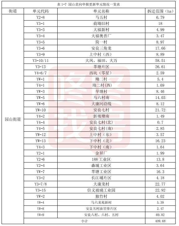 截止2019年8月份,横岗园山范围内共有已立项和正在申报63个更新单元,计划和意向拆除面积约 7平方公里。其中: