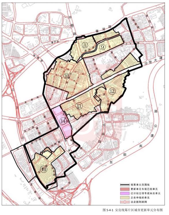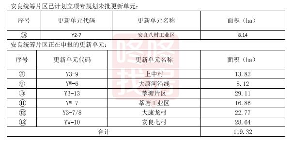 片区范围内已立项更新单元有1个,为安良八村工业区:正在申报更新单元有7个,分别是上中村(西)、上中村(东)、下中村(北)、下中村(南)、大康河沿线、莘塘片区、莘塘工业区、大康龙村、安良七村等更新单元。