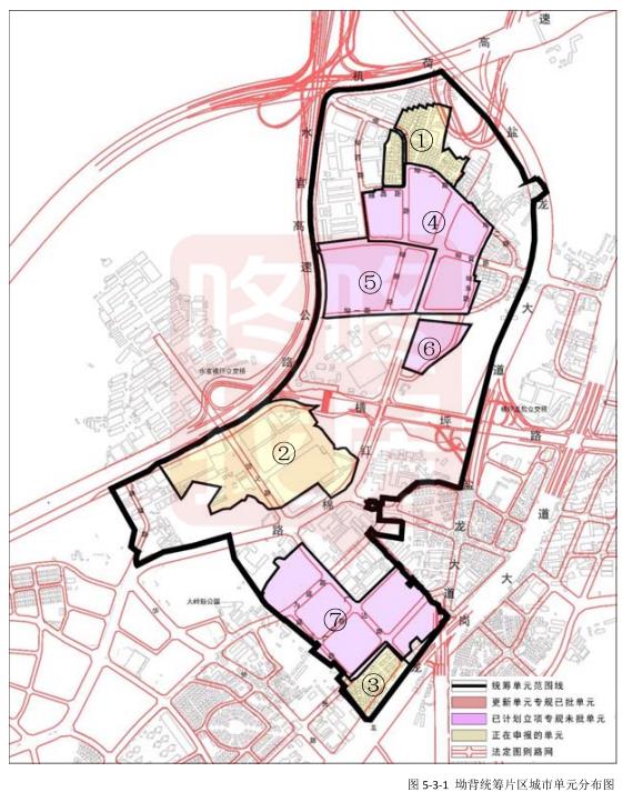 结合横岗、园山城市发展面临的突出问题,将更新单元连片地区,划分为5个片区统筹单元,总面积10.38平方公里,其中涉及到15个已计划立项更新单元,单元面积合计240公顷;30 个正在申报更新单,单元面积合计386公顼: