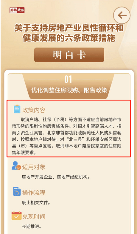 近日,河北省廊坊市发布的《关于支持房地产业良性循环和健康发展的六条措施》明白卡显示,取消户籍、社保(个税)等不适应当前房地产市场形势的限制性购房条件。