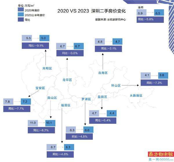 乐有家数据显示,在“715”新政、二手房指导价及疫情等多重影响下,深圳楼市的价格如今也已进入了下行区间,当前深圳二手房均价(成交价)约6.5万元/㎡,跟2020年相比已降了5.8%。