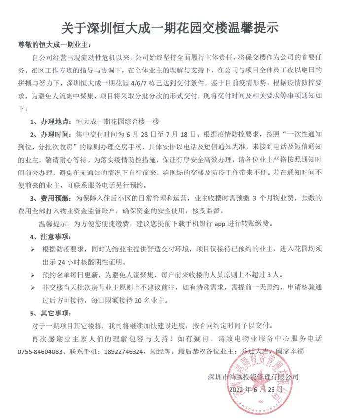 6月26日,深圳恒大城一期花园交楼温馨提示。