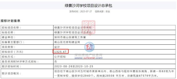 近日,深圳公共资源交易服务平台发面发布关于绿景沙河学校项目设计总承包公告。公告显示,项目招标估价1325.47万元;预计招标时间2023-8-26至2023-10-25。绿景沙河学校位于南山区沙河五村城市更新…