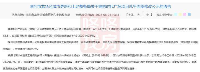 近日(6月24日),深圳市龙华区城市更新和土地整备局关于锦绣时代广场项目总平面图修改公示的通告。