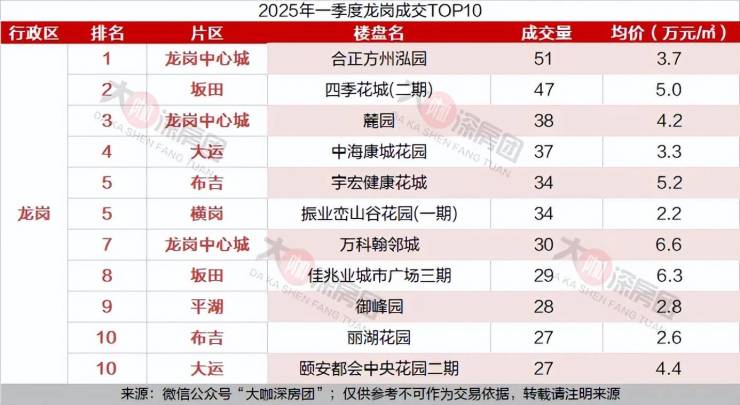 龙岗区成交量最高的则是龙岗中心城的合正方州泓园,成交量51套,均价为3.7万元/㎡。