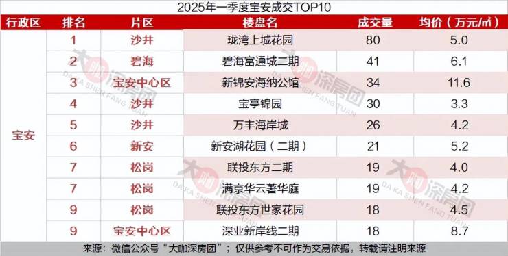 一季度深圳成交量最高的是宝安区沙井片区的珑湾上城花园,共成交80套,目前成交均价为5.0万元/㎡。