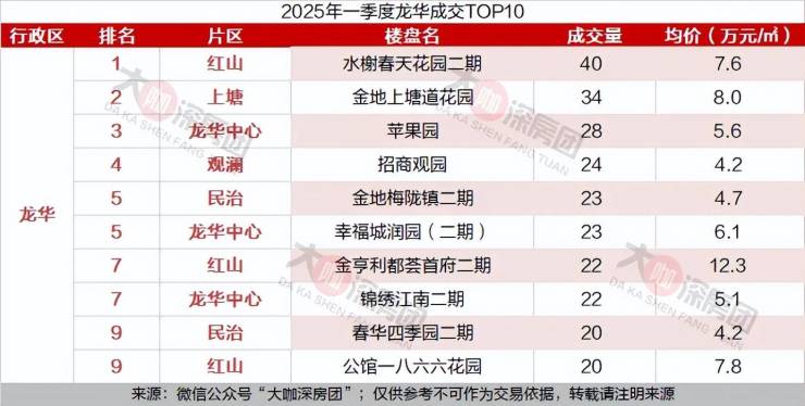 龙华区成交量最高的是红山片区的水榭春天花园二期,共成交40套,均价7.6万元/㎡。
