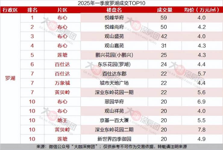 罗湖区成交前四的依旧是布心的悦峰华府、尚府,以及观山盛苑、嘉苑,四个小区均价都在4.0万元/㎡左右。