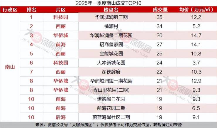 成交榜单中均价最高的小区是南山科技园片区的华润城润府三期,共成交35套,成交均价为12.2万元/㎡。