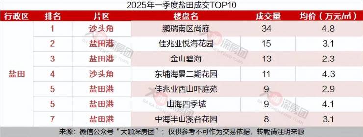 其次是盐田港片区的佳兆业悦海花园,共成交15套,均价为3.1万元/㎡。