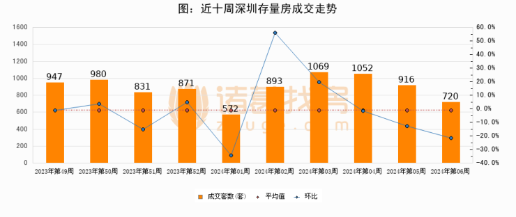 存量房方面,第05周深圳存量房成交720套,较上周减少196套,环比下降21.4%。从近十周成交走势来看,周均成交套数为885套,本周低于平均水平18.6%。