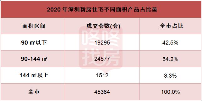 2020年深圳成交45384套新房住宅,其中90㎡以下的产品成交19295套,占全市总量的42.5%;90-144㎡改善型产品成交24577套,占总量的54.2%;144㎡以上的产品成交1512套,占总量的3.3%。