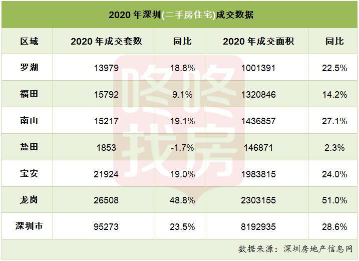2020年深圳新房市场供需两旺,强劲的购买力之下,频频出现打新日光盘,全年新房成交递交了一份十分靓丽的答卷。2020年全年深圳成交45384套新房住宅,同比增加19.8%;成交面积4488634平方米,同比增加20.5%。其中,龙岗、龙华、光明三区成交量先进。