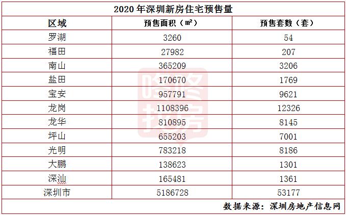 统计数据显示:2020年全年深圳预售53177套新房住宅,其中,龙岗、宝安、龙华、光明、坪山等是主力供应区域,龙岗区预售新房住宅12326套,宝安区预售新房住宅9621套,光明区预售新房住宅8186套。