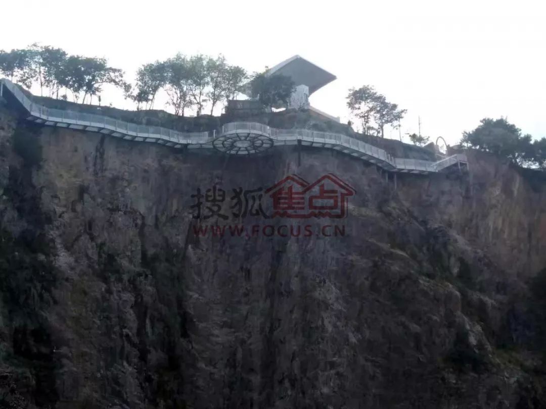 环视四周,水面上有环形泳池,观景台与建筑之间由廊桥相连,水榭亭台和喷泉,一样不少。峭壁之上有栈道,是当初运送建筑材料留下的,对面峭壁上方还建有空中玻璃栈道(下一个视角)。另外,酒店每间客房也都设有露台,可以全角度环顾整个矿坑的景色。