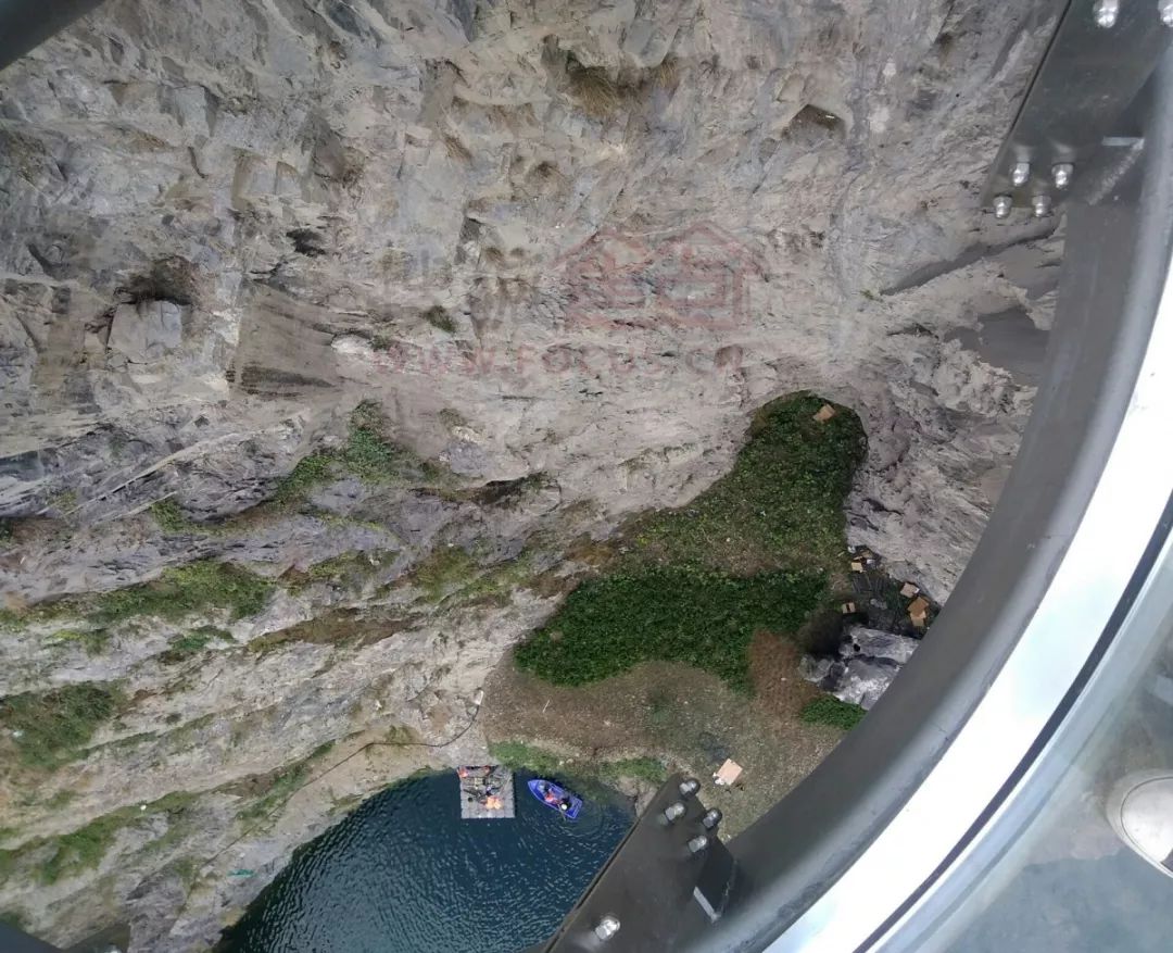 登上全玻璃的悬空观景平台,俯瞰整个酒店,才发现这里才是最震撼的视角。在深坑底部,仰望19层楼的感觉,真比不上站在透明玻璃栈道上上俯视深坑所带来的眩晕及震撼感。
