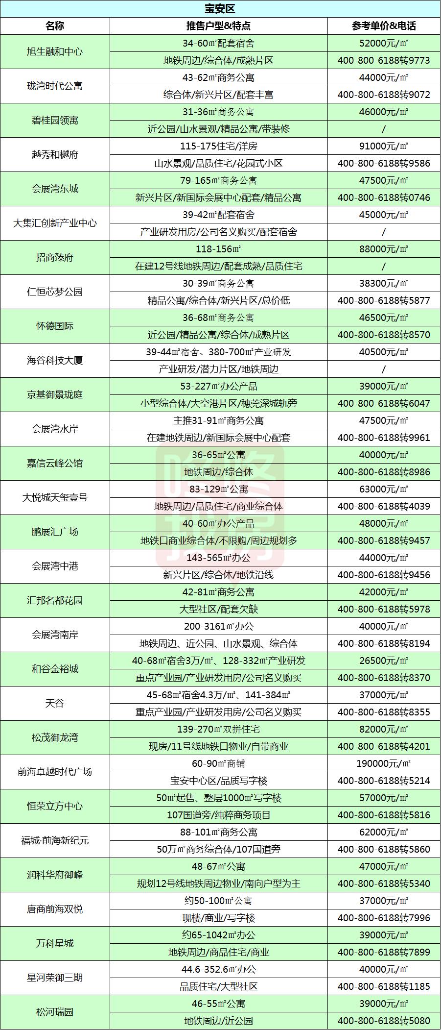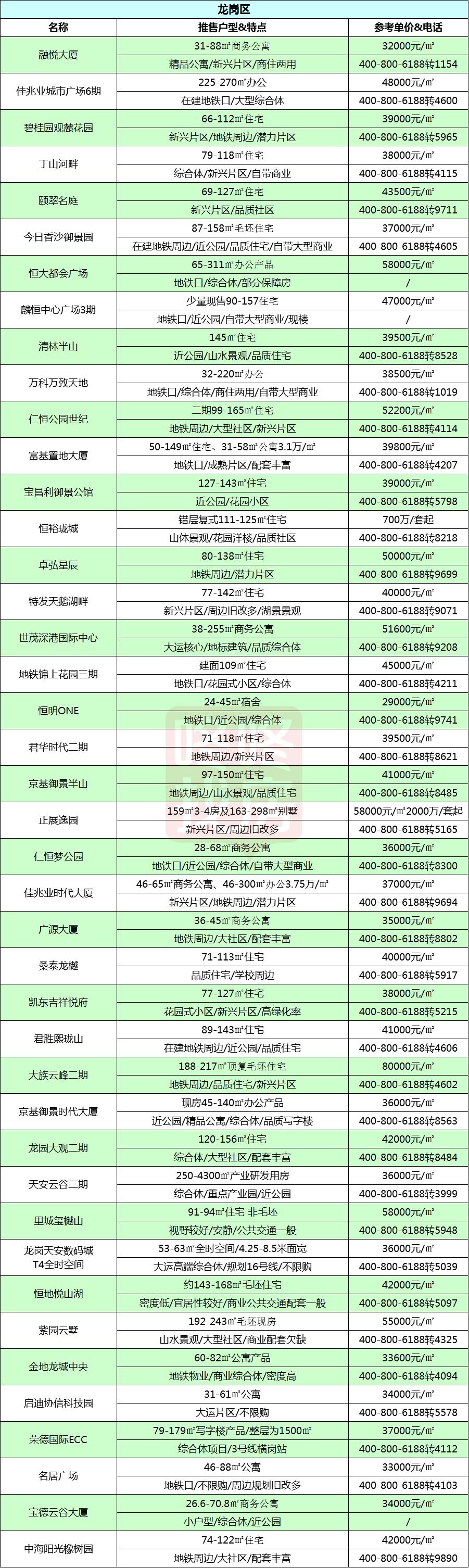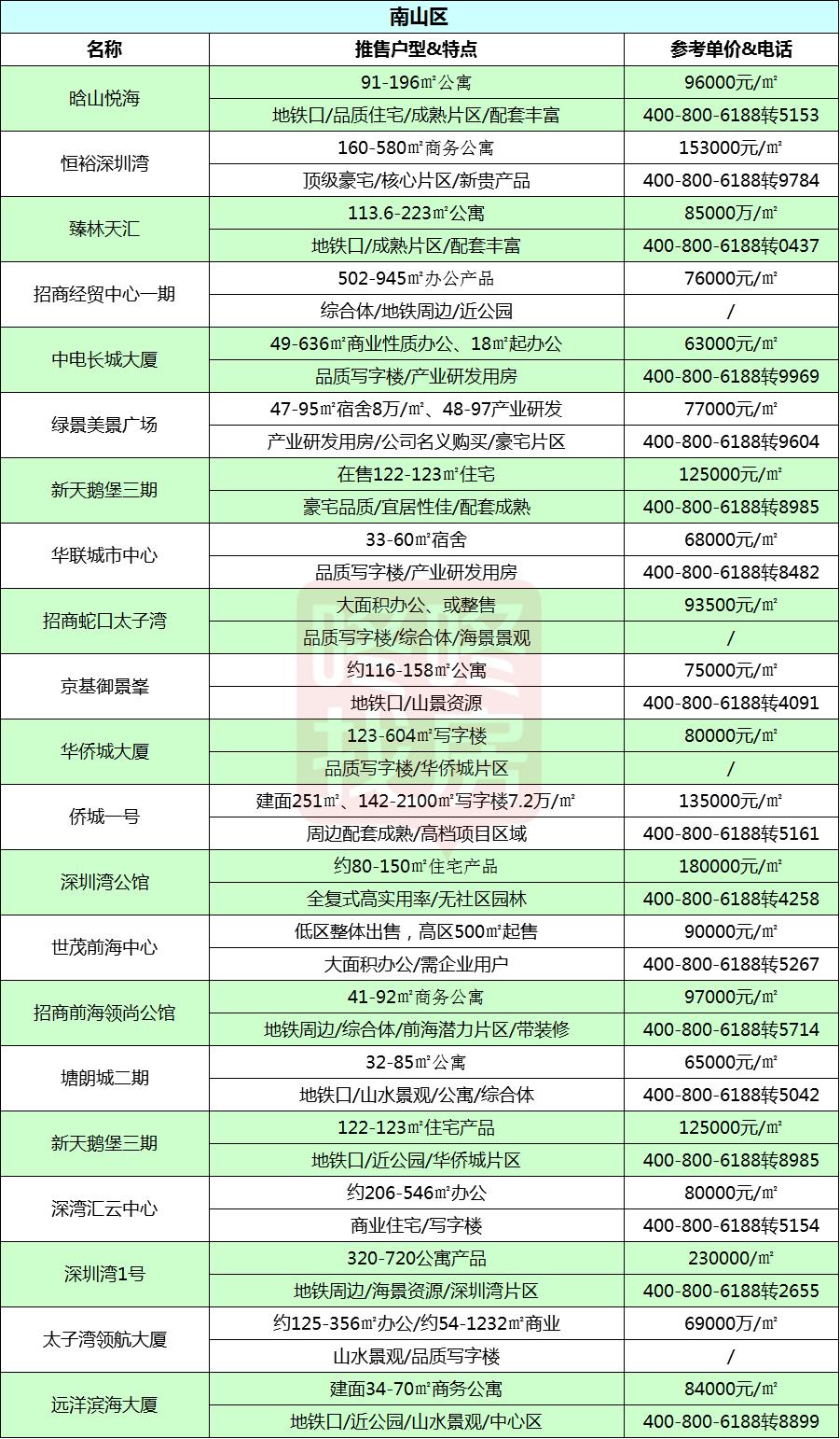 老牛统计了差不多191个深圳在售新盘,涵盖深圳各区主流在售的新盘,统计的信息包括了项目的400电话,主推的户型产品,以及楼盘的参考均价。