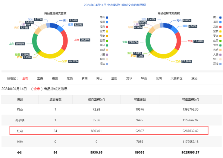 2024年4月14日新房住宅共网签84套。宝安22套;福田5套;龙岗 17套;罗湖1套;南山7套;盐田1套;龙华16套;坪山6套;光明6套;大鹏0套;深汕3套。
