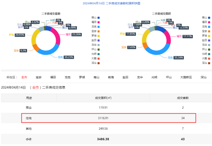2024年4月14日二手房住宅网签34套。宝安4套;福田4套;龙岗12套;罗湖7套;南山3套;盐田0套;龙华3套;光明0套;坪山1套;大鹏0套。