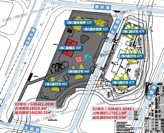 其中01地块占地面积约1.8万㎡,建筑面积约14.6万㎡,主要包含2座住宅、1座酒店及办公混合建筑和2座安居房。