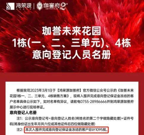 今天,西部网红盘鸿荣源珈誉府公示了意向登记名单,共有1095批客户成功登记,项目推1067套房,认筹比超过1:1。