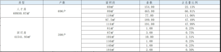 聚焦到人才房来看,根据规划显示,人才房户型有3种建面,包括约69㎡2房(154套),约89㎡3房(465套),以及约118㎡4房(77套)。