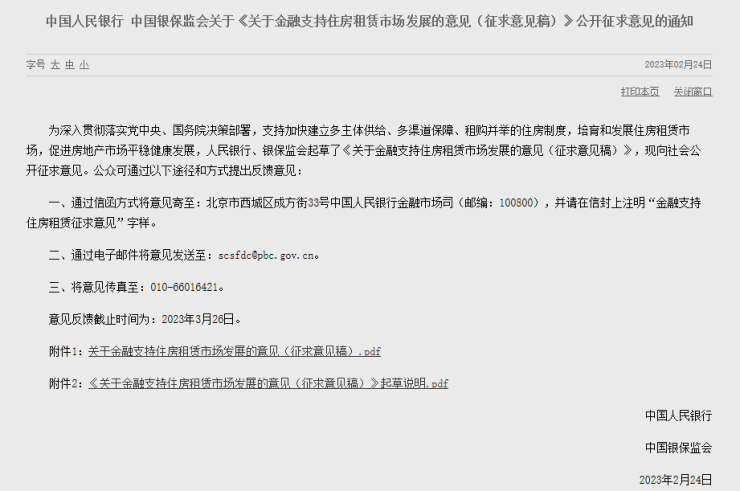 2月24日晚,中国人民银行、中国银保监会联合发布关于《关于金融支持住房租赁市场发展的意见(征求意见稿)》公开征求意见的通知。
