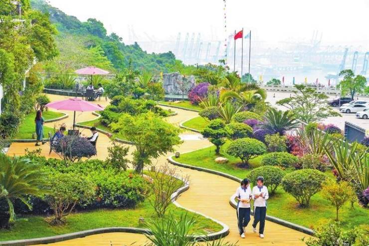 在依山傍海的盐田高级中学漫步,移步换景,一路芬芳,整个校园熠熠发光,自成五彩斑斓的诗篇。在学校梧桐山书院的馆外,两个拥有无敌海景的空中花园,让面朝大海、春暖花开的诗意画境走进了盐高。春夏之季,空中花园里的月季竞相绽放,在绿叶的衬托下更显斑斓。 (深圳晚报记者 王宇 陈仪衡 )