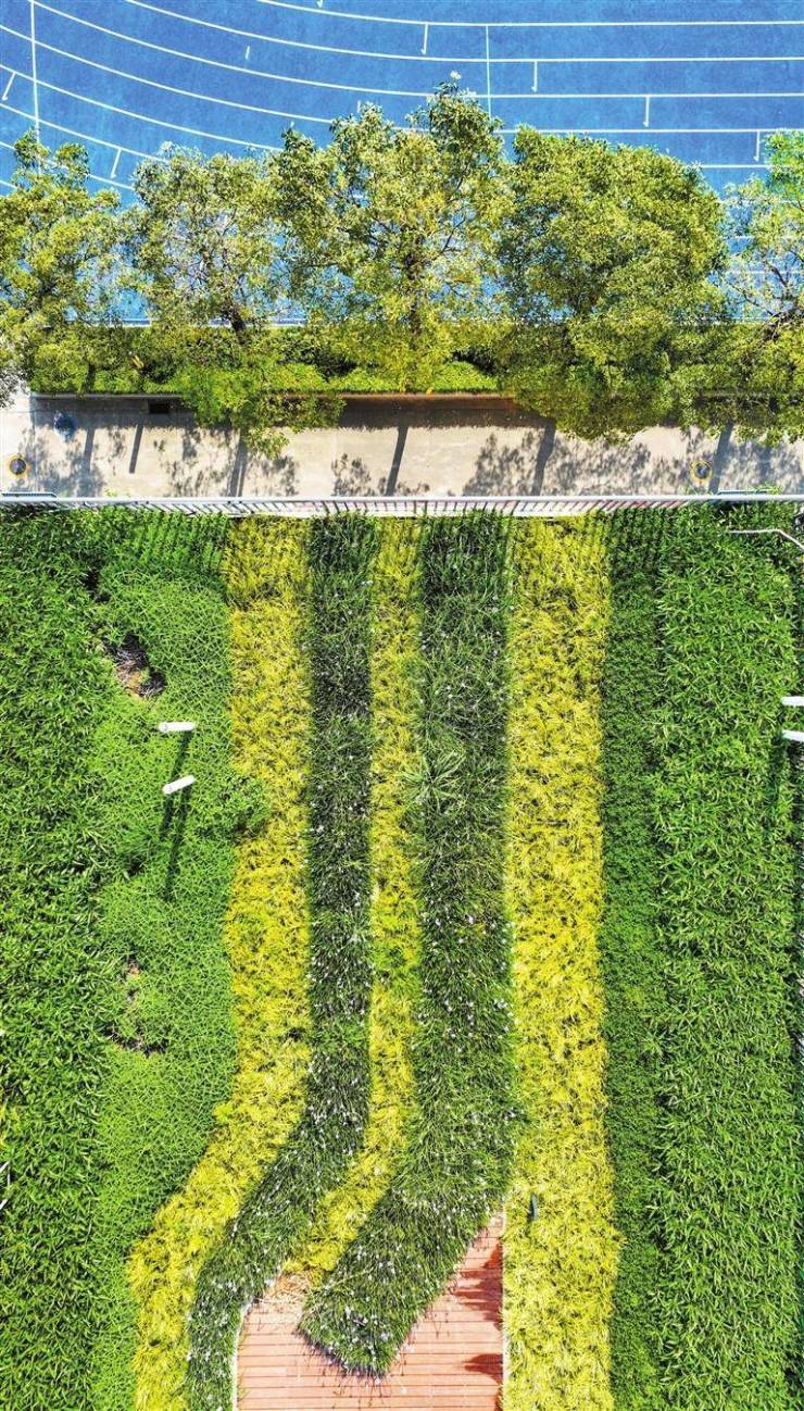 南山外国语学校(集团)滨海小学的楼顶花园,在设计理念上融入了海洋的元素。园路设计犹如一个个海浪,运用多种不同植物,不同季节开花,不同色叶,与园路交汇融合,像是红树林公园的微缩景观。屋顶融入了多种科学体验园,有茶园、药园、香料园、百草园。