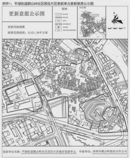 1月14日,龙岗区更新整备局发布关于平湖街道鹅公岭社区居住片区更新项目意愿公示,拆除用地面积约5.1万㎡。
