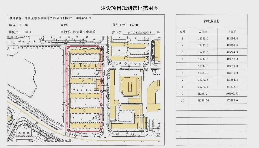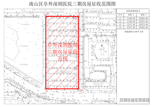 深圳市南山区阜外深圳医院三期项目房屋征收范围东至乌石头路,北至朗祥二路,西至阜外深圳医院, 南至朗山路,征收范围的土地面积共14186.48 ㎡,征收房屋建筑面积共27855.52 ㎡。