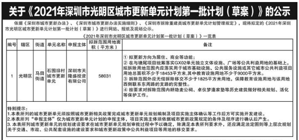 光明区更新整备局发布关于《2021年深圳市光明区城市更新单元计划排名前列批计划(草案)》,共一个“商住”项目,即石围旧村城市更新单元。