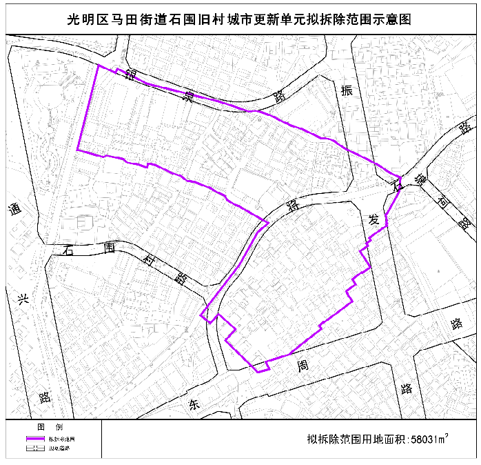 石围旧村更新项目位于光明区马田街道,东周路与振发路西北侧。该项目拟拆除范围用地面积58031㎡,更新方向为居住、商业等功能。