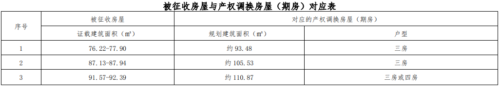 被征收人选择期房进行产权调换的,产权调换房屋对照下表执行,产权调换房屋的建筑面积最终以房屋竣工测绘报告为准。