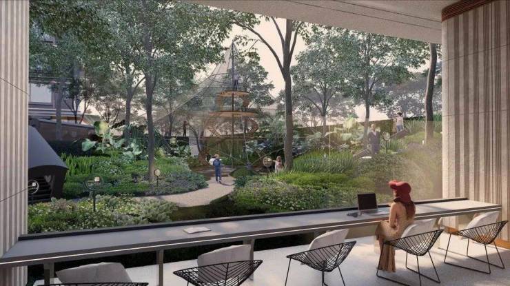 园林设计上,项目打造微度假社区,规划Hi-Vacation Block(类度假园) 、CaloriePark(运动公园)、社区植物探索园三大空间场景:类度假园规划约300㎡空中戏水池,紫花风铃木台地花园,为社区打造季节性网红景点。