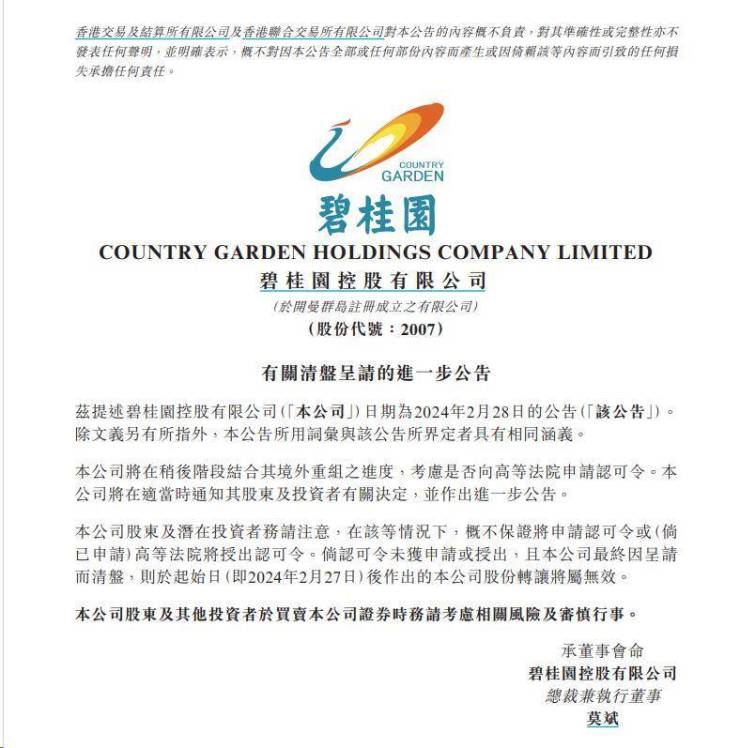 3月4日晚间,碧桂园于港交所发布有关清盘呈请的进一步公告,公司将在稍后阶段结合其境外重组之进度,考虑是否向高等法院申请认可令,概不保证将申请认可令或高等法院将授出认可令。公司将在适当时通知其股东及投资者有关决定,并作出进一步公告。