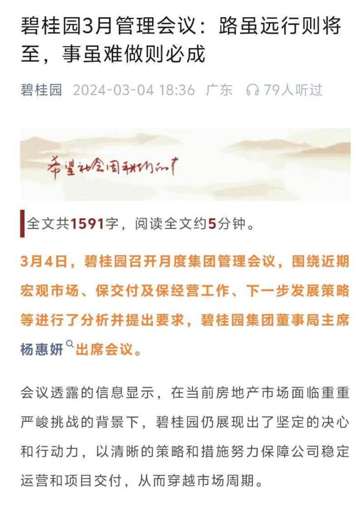 3月4日晚间,碧桂园官微发布消息称,公司于当日召开月度集团管理会议,围绕近期宏观市场、保交付及保经营工作、下一步发展策略等进行了分析并提出要求,碧桂园集团董事局主席杨惠妍出席会议。