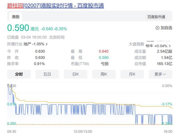3月4日,碧桂园报收于0.590港元/股,当日跌幅为6.35%,总市值为165.1亿港元。