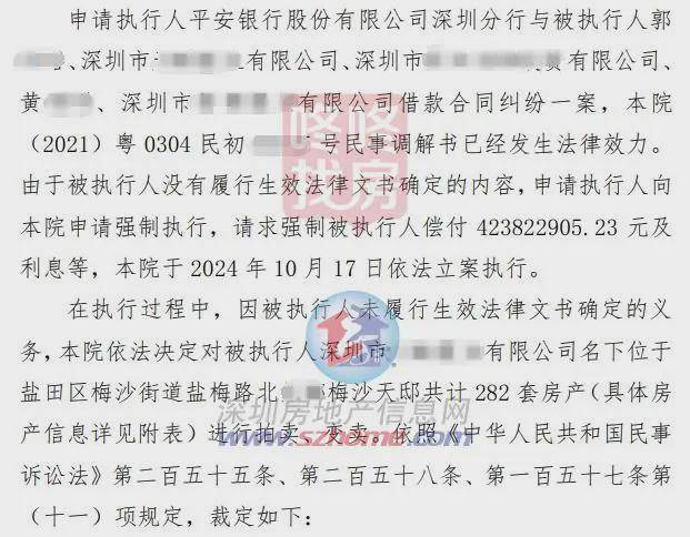 该批法拍房是由于开发商与深圳一家银行的借款纠纷,需要偿付约4.24亿。