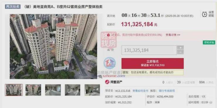 该楼盘为美地亚商苑A、B座,共62套商业房产整体拍卖,起拍价1.31亿元,评估价2.56亿。该批房产也属于商业办公性质。