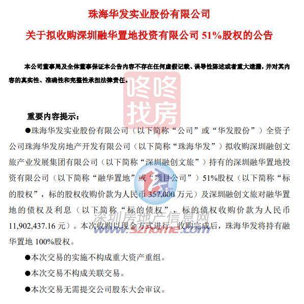 2023年1月4日,珠海华发发布《关于拟收购深圳融华置地投资有限公司 51%股权的公告》。