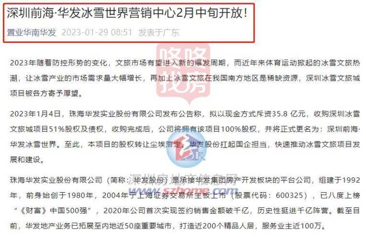 近日,华发官方公众号@置业华南华发发布消息,公布了深圳冰雪文旅城的最新名字,为深圳前海·华发冰雪世界,并且表示营销中心计划2月中旬开放,华发冰雪世界2025年11月营业!