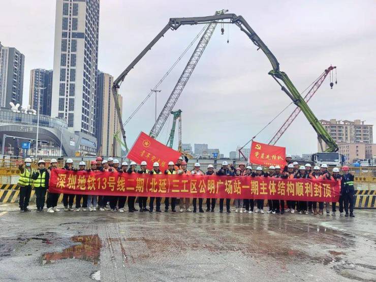 近日,13号线二期(北延)🚏公明广场站一期主体结构最后一块顶板顺利封顶,为下一步施工奠定坚实基础!